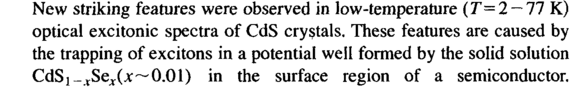 New striking features were observed in low-temperature (7=2 —77 K) optical excitonic spectra of CdS crystals. These features are caused by the trapping of excitons in a potential well formed by the solid solution CdSj-vSe^x—O.Ol) in the surface region of a semiconductor.