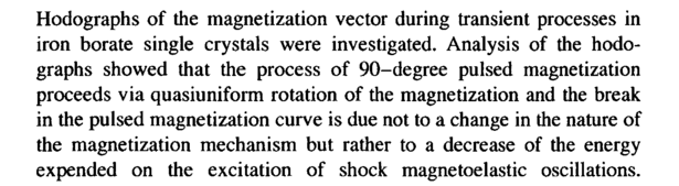 Hodographs of the magnetization vector obtained during 90-degree pulsed magnetization of iron borate single crystals