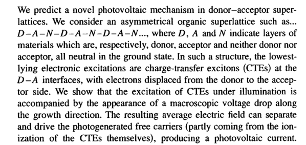We predict a novel photovoltaic mechanism in donor-acceptor super-lattices. We consider an asymmetrical organic superlattice such as... D-A-N-D-A-N-D-A-N..., where D, A and N indicate layers of materials which are, respectively, donor, acceptor and neither donor nor acceptor, all neutral in the ground state. In such a structure, the lowest-lying electronic excitations are charge-transfer excitons (CTEs) at the D-A interfaces, with electrons displaced from the donor to the acceptor side. We show that the excitation of CTEs under illumination is accompanied by the appearance of a macroscopic voltage drop along the growth direction. The resulting average electric field can separate and drive the photogenerated free carriers (partly coming from the ionization of the CTEs themselves), producing a photovoltaic current.