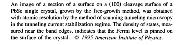 An image of a section of a surface on a (100) cleavage surface of a PbSe single crystal, grown by the free-growth method, was obtained with atomic resolution by the method of scanning tunneling microscopy in the tunneling current stabilization regime. The density of states, measured near the band edges, indicates that the Fermi level is pinned on the surface of the crystal. © 1995 American Institute of Physics.