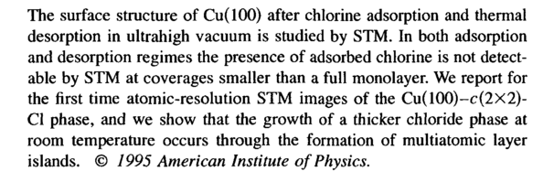 The surface structure of Cu(100) after chlorine adsorption and thermal desorption in ultrahigh vacuum is studied by STM. In both adsorption and desorption regimes the presence of adsorbed chlorine is not detectable by STM at coverages smaller than a full monolayer. We report for the first time atomic-resolution STM images of the Cu(100)-c(2X2)-Cl phase, and we show that the growth of a thicker chloride phase at room temperature occurs through the formation of multiatomic layer islands. © 1995 American Institute of Physics.
