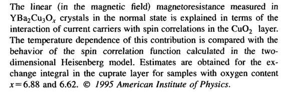 The linear (in the magnetic field) magnetoresistance measured in YBa2Cu30^ crystals in the normal state is explained in terms of the interaction of current carriers with spin correlations in the Cu02 layer. The temperature dependence of this contribution is compared with the behavior of the spin correlation function calculated in the two-dimensional Heisenberg model. Estimates are obtained for the exchange integral in the cuprate layer for samples with oxygen content x = 6.88 and 6.62. © 1995 American Institute of Physics.