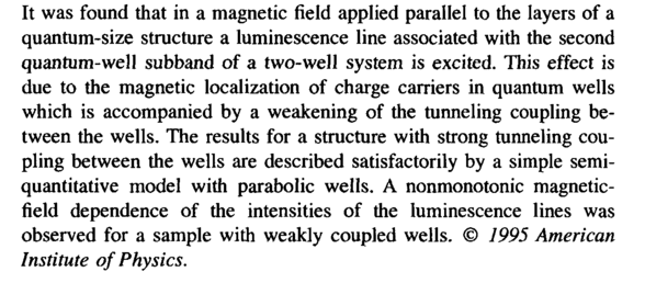 It was found that in a magnetic field applied parallel to the layers of a quantum-size structure a luminescence line associated with the second quantum-well subband of a two-well system is excited. This effect is due to the magnetic localization of charge carriers in quantum wells which is accompanied by a weakening of the tunneling coupling between the wells. The results for a structure with strong tunneling coupling between the wells are described satisfactorily by a simple semiquantitative model with parabolic wells. A nonmonotonic magnetic-field dependence of the intensities of the luminescence lines was observed for a sample with weakly coupled wells. © 1995 American Institute of Physics.