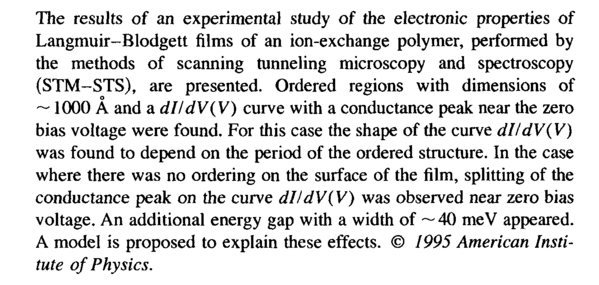 The results of an experimental study of the electronic properties of Langmuir-Blodgett films of an ion-exchange polymer, performed by the methods of scanning tunneling microscopy and spectroscopy (STM-STS), are presented. Ordered regions with dimensions of ~ 1000 A and a dI/dV(V) curve with a conductance peak near the zero bias voltage were found. For this case the shape of the curve dIldV(V) was found to depend on the period of the ordered structure. In the case where there was no ordering on the surface of the film, splitting of the conductance peak on the curve dI/dV(V) was observed near zero bias voltage. An additional energy gap with a width of ~ 40 meV appeared. A model is proposed to explain these effects. © 1995 American Institute of Physics.
