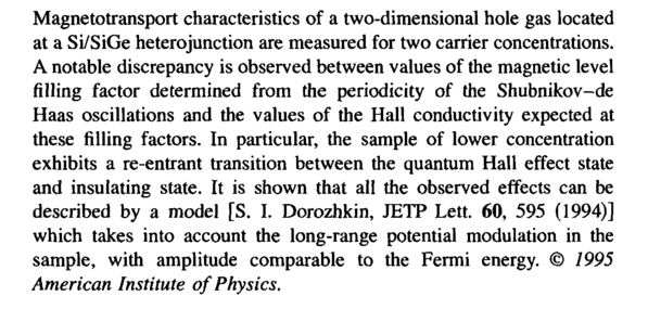 Magnetotransport characteristics of a two-dimensional hole gas located at a Si/SiGe heterojunction are measured for two carrier concentrations. A notable discrepancy is observed between values of the magnetic level filling factor determined from the periodicity of the Shubnikov-de Haas oscillations and the values of the Hall conductivity expected at these filling factors. In particular, the sample of lower concentration exhibits a re-entrant transition between the quantum Hall effect state and insulating state. It is shown that all the observed effects can be described by a model [S. I. Dorozhkin, JETP Lett. 60, 595 (1994)] which takes into account the long-range potential modulation in the sample, with amplitude comparable to the Fermi energy. © 1995 American Institute of Physics.