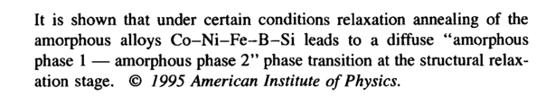 It is shown that under certain conditions relaxation annealing of the amorphous alloys Co-Ni-Fe-B-Si leads to a diffuse "amorphous phase 1 — amorphous phase 2" phase transition at the structural relaxation stage. © 7995 American Institute of Physics.