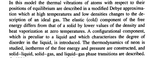 In this model the thermal vibrations of atoms with respect to their positions of equilibrium are described in a modified Debye approximation which at high temperatures and low densities changes to the description of an ideal gas. The elastic (cold) component of the free energy differs from that of a solid by lower values of the density and heat vaporization at zero temperatures. A configurational component, which is peculiar to a liquid and which characterizes the degree of disorder in the liquid, is introduced. The thermodynamics of neon is studied, isotherms of the free energy and pressure are constructed, and solid-liquid, solid-gas, and liquid-gas phase transitions are described.