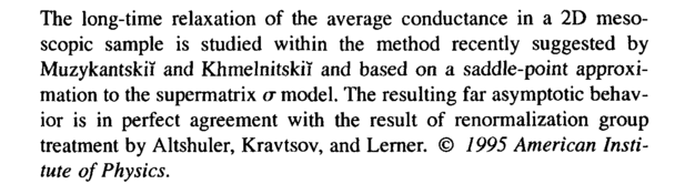 The long-time relaxation of the average conductance in a 2D meso-scopic sample is studied within the method recently suggested by Muzykantskii and Khmelnitskii and based on a saddle-point approximation to the supermatrix σ model. The resulting far asymptotic behavior is in perfect agreement with the result of renormalization group treatment by Altshuler, Kravtsov, and Lerner. © 1995 American Institute of Physics.