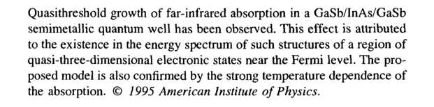 Quasithreshold growth of far-infrared absorption in a GaSb/InAs/GaSb semimetallic quantum well has been observed. This effect is attributed to the existence in the energy spectrum of such structures of a region of quasi-three-dimensional electronic states near the Fermi level. The proposed model is also confirmed by the strong temperature dependence of the absorption. © 1995 American Institute of Physics.
