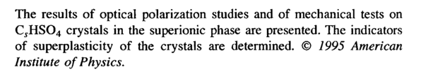 The results of optical polarization studies and of mechanical tests on CfHS04 crystals in the superionic phase are presented. The indicators of superplasticity of the crystals are determined. © 1995 American Institute of Physics.
