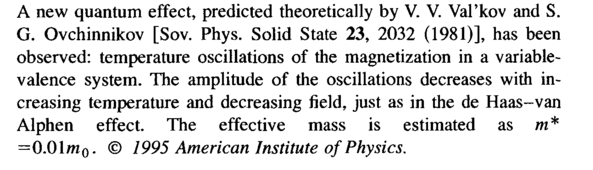 A new quantum effect, predicted theoretically by V. V. Val'kov and S. G. Ovchinnikov [Sov. Phys. Solid State 23, 2032 (1981)], has been observed: temperature oscillations of the magnetization in a variable-valence system. The amplitude of the oscillations decreases with increasing temperature and decreasing field, just as in the de Haas-van Alphen effect. The effective mass is estimated as m* =0.01m0. © 1995 American Institute of Physics.