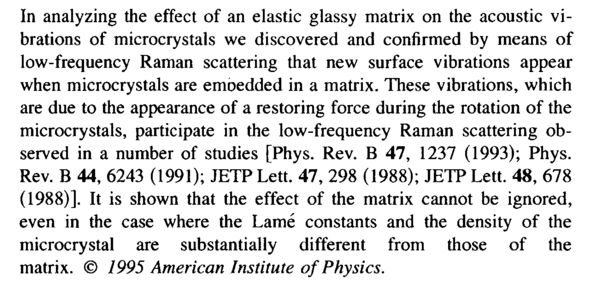 In analyzing the effect of an elastic glassy matrix on the acoustic vibrations of microcrystals we discovered and confirmed by means of low-frequency Raman scattering that new surface vibrations appear when microcrystals are emoedded in a matrix. These vibrations, which are due to the appearance of a restoring force during the rotation of the microcrystals, participate in the low-frequency Raman scattering observed in a number of studies [Phys. Rev. В 47, 1237 (1993); Phys. Rev. В 44, 6243 (1991); JETP Lett. 47, 298 (1988); JETP Lett. 48, 678 (1988)]. It is shown that the effect of the matrix cannot be ignored, even in the case where the Lame constants and the density of the microcrystal are substantially different from those of the matrix. © 1995 American Institute of Physics.