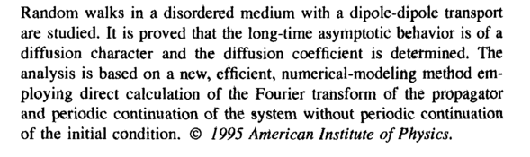 Random walks in a disordered medium with a dipole-dipole transport are studied. It is proved that the long-time asymptotic behavior is of a diffusion character and the diffusion coefficient is determined* The analysis is based on a new, efficient, numerical-modeling method employing direct calculation of the Fourier transform of the propagator and periodic continuation of the system without periodic continuation of the initial condition. © 1995 Arrierican Institute of Physics.