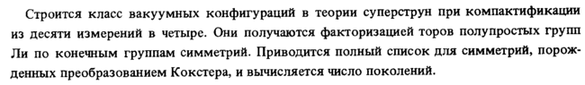 Строится класс вакуумных конфигураций в теории суперструн при компактификации из десяти измерений в четыре. Они получаются факторизацией торов полупростых групп Ли по конечным группам симметрий. Приводится полный список для симметрий, порожденных преобразованием Кокстера, и вычисляется число поколений.