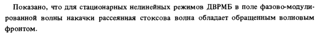 Показано, что для стационарных нелинейных режимов ДВРМБ в поле фазово-модударованной волны накачки рассеянная стоксова волна обладает обращенным волновым фронтом.
