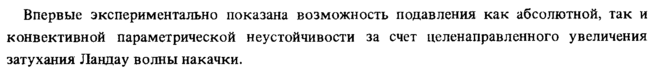 Впервые экспериментально показана возможность подавления как абсолютной, так и конвективной параметрической неустойчивости за счет целенаправленного увеличения затухания Ландау волны накачки.