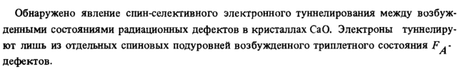 Обнаружено явление спин-селективного электронного туннелирования между возбужденными состояниями радиационных дефектов в кристаллах СаО. Электроны туннелиру-ют лишь из отдельных спиновых подуровней возбужденного триплетного состояния F^-дефектов.