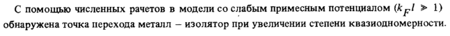С помощью численных рачетов в модели со слабым примесным потенциалом (kpl > 1) обнаружена точка перехода металл изолятор при увеличении степени квазиодномерности.