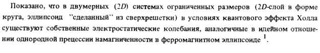 Показано, что в двумерных (2D) системах ограниченных размеров (2£)-слой в форме круга, эллипсоид "сделанный" из сверхрешетки) в условиях квантового эффекта Холла существуют собственные электростатические колебания, аналогичные в идейном отношении однородной прецессии намагниченности в ферромагнитном эллипсоиде *.