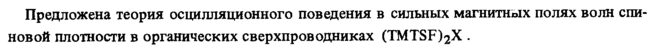 Предложена теория осцилляционного поведения в сильных магнитных полях волн спиновой плотности в органических сверхпроводниках (TMTSF^X ·
