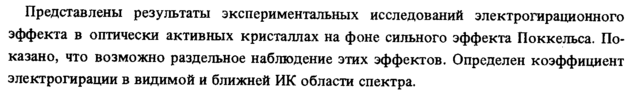 Представлены результаты экспериментальных исследований электрогирационного эффекта в оптически активных кристаллах на фоне сильного эффекта Поккельса. Показано, что возможно раздельное наблюдение этих эффектов. Определен коэффициент электрогирации в видимой и ближней ИК области спектра.