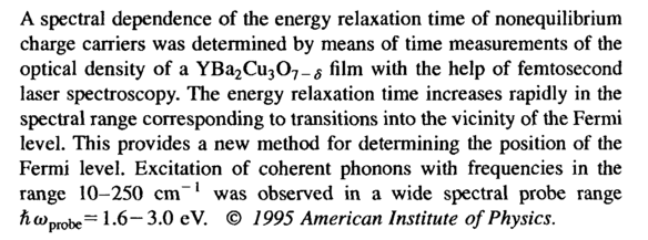A spectral dependence of the energy relaxation time of nonequilibrium charge carriers was determined by means of time measurements of the optical density of a YBa2Cu307_5 film with the help of femtosecond laser spectroscopy. The energy relaxation time increases rapidly in the spectral range corresponding to transitions into the vicinity of the Fermi level. This provides a new method for determining the position of the Fermi level. Excitation of coherent phonons with frequencies in the range 10-250 cm"1 was observed in a wide spectral probe range ÐÛÒÀøÅ= 1-6—3.0 eV. © 1995 American Institute of Physics.