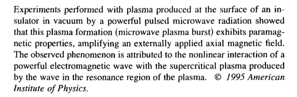 Experiments performed with plasma produced at the surface of an insulator in vacuum by a powerful pulsed microwave radiation showed that this plasma formation (microwave plasma burst) exhibits paramagnetic properties, amplifying an externally applied axial magnetic field. The observed phenomenon is attributed to the nonlinear interaction of a powerful electromagnetic wave with the supercritical plasma produced by the wave in the resonance region of the plasma. © 1995 American Institute of Physics.