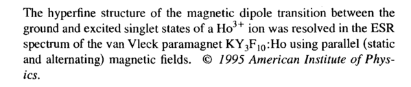 The hyperfine structure of the magnetic dipole transition between the ground and excited singlet states of a Ho3+ ion was resolved in the ESR spectrum of the van Vleck paramagnet KY3F10:Ho using parallel (static and alternating) magnetic fields. © 1995 American Institute ofPhys-
