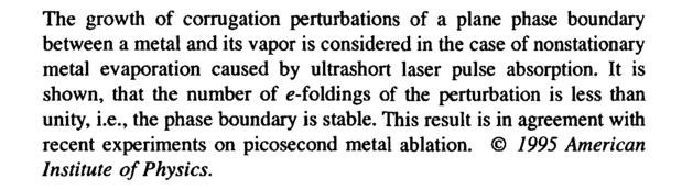 The growth of corrugation perturbations of a plane phase boundary between a metal and its vapor is considered in the case of nonstationary metal evaporation caused by ultrashort laser pulse absorption. It is shown, that the number of e-foldings of the perturbation is less than unity, i.e., the phase boundary is stable. This result is in agreement with recent experiments on picosecond metal ablation. © 1995 American Institute of Physics.