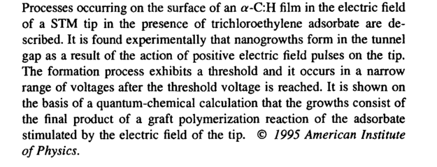Processes occurring on the surface of an a-C:H film in the electric field of a STM tip in the presence of trichloroethylene adsorbate are described. It is found experimentally that nanogrowths form in the tunnel gap as a result of the action of positive electric field pulses on the tip. The formation process exhibits a threshold and it occurs in a narrow range of voltages after the threshold voltage is reached. It is shown on the basis of a quantum-chemical calculation that the growths consist of the final product of a graft polymerization reaction of the adsorbate stimulated by the electric field of the tip. © 1995 American Institute of Physics.