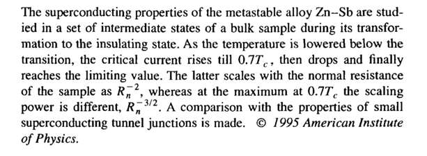 The superconducting properties of the metastable alloy Zn-Sb are studied in a set of intermediate states of a bulk sample during its transformation to the insulating state. As the temperature is lowered below the transition, the critical current rises till 0JTc, then drops and finally reaches the limiting value. The latter scales with the normal resistance of the sample as R~2, whereas at the maximum at 0JTc the scaling power is different, R^3'2. A comparison with the properties of small superconducting tunnel junctions is made. © 7995 American Institute of Physics.