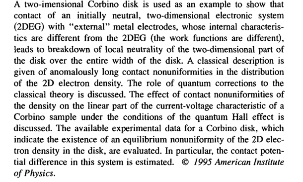 A two-imensional Corbino disk is used as an example to show that contact of an initially neutral, two-dimensional electronic system (2DEG) with "external" metal electrodes, whose internal characteristics are different from the 2DEG (the work functions are different), leads to breakdown of local neutrality of the two-dimensional part of the disk over the entire width of the disk. A classical description is given of anomalously long contact nonuniformities in the distribution of the 2D electron density. The role of quantum corrections to the classical theory is discussed. The effect of contact nonuniformities of the density on the linear part of the current-voltage characteristic of a Corbino sample under the conditions of the quantum Hall effect is discussed. The available experimental data for a Corbino disk, which indicate the existence of an equilibrium nonuniformity of the 2D electron density in the disk, are evaluated. In particular, the contact potential difference in this system is estimated. © 1995 American Institute of Physics.