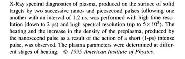 X-Ray spectral diagnostics of plasma, produced on the surface of solid targets by two successive nanoand picosecond pulses following one another with an interval of 1.2 ns, was performed with high time resolution (down to 2 ps) and high spectral resolution (up to 5X 103). The heating and the increase in the density of the preplasma, produced by the nanosecond pulse as a result of the action of a short (1-ps) intense pulse, was observed. The plasma parameters were determined at different stages of heating. © 1995 American Institute of Physics.