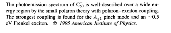 The photoemission spectrum of C^q is well-described over a wide energy region by the small polaron theory with polaron-exciton coupling. The strongest coupling is found for the Ag2 pinch mode and an —0.5 eV Frenkel exciton. © 1995 American Institute of Physics.