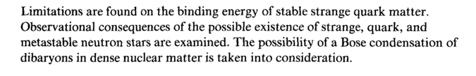 Limitations are found on the binding energy of stable strange quark matter. Observational consequences of the possible existence of strange, quark, and metastable neutron stars are examined. The possibility of a Bose condensation of dibaryons in dense nuclear matter is taken into consideration.