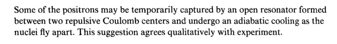 Some of the positrons may be temporarily captured by an open resonator formed between two repulsive Coulomb centers and undergo an adiabatic cooling as the nuclei fly apart. This suggestion agrees qualitatively with experiment.