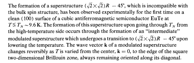 The formation of a superstructure (ÔäèÔä)ë — 45°, which is incompatible with the bulk spin structure, has been observed experimentally for the first time on a clean (100) surface of a cubic antiferromagnetic semiconductor EuTe at TS TN ~ 9.6 K. The formation of this superstructure upon going through TN from the high-temperature side occurs through the formation of an "intermediate" modulated superstructure which undergoes a transition to (^2 X y/2 )R — 45° upon lowering the temperature. The wave vector Ë of a modulated superstructure changes reversibly as Τ is varied from the center, Ë = 0, to the edge of the square two-dimensional Brillouin zone, always remaining oriented along its diagonal.