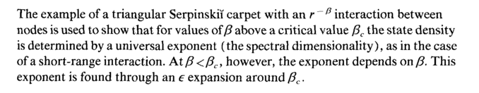 The example of a triangular Serpinskii carpet with an r ~~13 interaction between nodes is used to show that for values of β above a critical value Pc the state density is determined by a universal exponent (the spectral dimensionality), as in the case of a short-range interaction. Athowever, the exponent depends on β. This exponent is found through an e expansion around β€.
