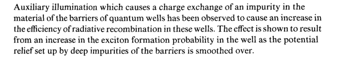 Auxiliary illumination which causes a charge exchange of an impurity in the material of the barriers of quantum wells has been observed to cause an increase in the efficiency of radiative recombination in these wells. The effect is shown to result from an increase in the exciton formation probability in the well as the potential relief set up by deep impurities of the barriers is smoothed over.