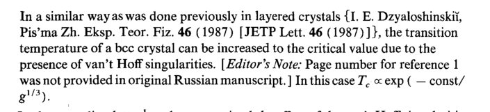 In a similar way as was done previously in layered crystals {I. E. Dzyaloshinskii, Pis'ma Zh. Eksp. Teor. Fiz. 46 (1987) [ JETP Lett. 46 (1987)]}, the transition temperature of a bcc crystal can be increased to the critical value due to the presence of van't Hoff singularities. [Editor's Note: Page number for reference 1 was not provided in original Russian manuscript. ] In this case Tc cc exp ( — const/ gm)a
