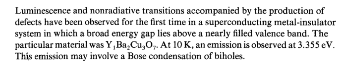 Luminescence and nonradiative transitions accompanied by the production of defects have been observed for the first time in a superconducting metal-insulator system in which a broad energy gap lies above a nearly filled valence band. The particular material was Y1Ba2Cu307. At 10 K, an emission is observed at 3.355 eV. This emission may involve a Bose condensation of biholes.