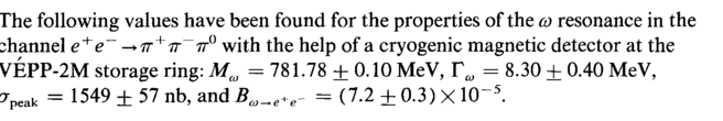 The following values have been found for the properties of the ω resonance in the channel e+e~~ ^π+π~π° with the help of a cryogenic magnetic detector at the VEPP-2M storage ring: Μω = 781.78 ± 0.10 MeV, Τω = 8.30 ± 0.40 MeV, =W = 1549±57Ðø,ÁÛ1ä^Ê+Å(7.2 ± 0.3) X 10~5.