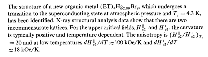 The structure of a new organic metal (ET)4Hg2 89Br8, which undergoes a transition to the superconducting state at atmospheric pressure and Tc = 4.3 K, has been identified. X-ray structural analysis data show that there are two incommensurate lattices. For the upper critical fields, Η Ц2 and Η lc2, the curvature is typically positive and temperature dependent. The anisotropy is {Hl2/Hlcl)Tc = 20 and at low temperatures dH \2 /dT ~ 100 kOe/K and dH lcl /dT ~18kOe/K.