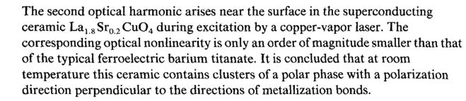 The second optical harmonic arises near the surface in the superconducting ceramic Laj 8Sr0 2CuO4 during excitation by a copper-vapor laser. The corresponding optical nonlinearity is only an order of magnitude smaller than that of the typical ferroelectric barium titanate. It is concluded that at room temperature this ceramic contains clusters of a polar phase with a polarization direction perpendicular to the directions of metallization bonds.