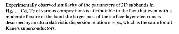 Experimentally observed similarity of the parameters of 2D subbands in Hg, _ x Сйх Те of various compositions is attributable to the fact that even with a moderate flexure of the band the larger part of the surface-layer electrons is described by an ultrarelativistic dispersion relation e = ps, which is the same for all Kane's superconductors.