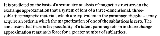 It is predicted on the basis of a symmetry analysis of magnetic structures in the exchange approximation that a system of ions of a three-dimensional, three-sublattice magnetic material, which are equivalent in the paramagnetic phase, may acquire an order in which the magnetization of one of the sublattices is zero. The conclusion that there is the possibility of a latent paramagnetism in the exchange approximation remains in force for a greater number of sublattices.