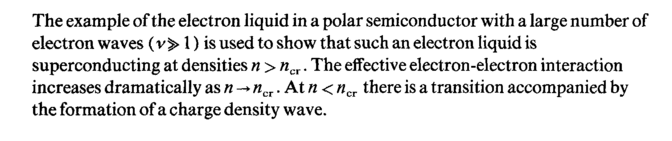 The example of the electron liquid in a polar semiconductor with a large number of electron waves (v> 1) is used to show that such an electron liquid is superconducting at densities n>ncr. The effective electron-electron interaction increases dramatically as η -»ncr. At η < ncr there is a transition accompanied by the formation of a charge density wave.