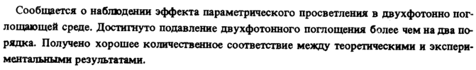 Сообщается о наблюдении эффекта параметрического просветления в двухфотонно поглощающей среде. Достигнуто подавление двухфотонного поглощения более чем на два порядка. Получено хорошее количественное соответствие между теоретическими и экспериментальными результатами.