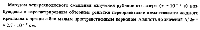 Методом четырехволнового смешения излучения рубинового лазера (г ~ 10" 3 с) возбуждены и зарегистрированы объемные решетки переориентации нематического жидкого кристалла с чрезвычайно малым пространственным периодом Λ вплоть до значений Л/ 2π = = 2,7-10-* см.