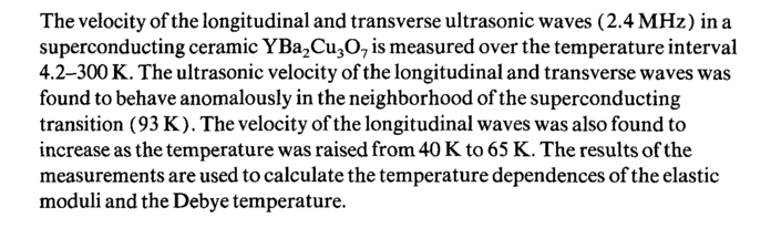 The velocity of the longitudinal and transverse ultrasonic waves (2.4 MHz) in a superconducting ceramic YBa2Cu307 is measured over the temperature interval 4.2-300 K. The ultrasonic velocity of the longitudinal and transverse waves was found to behave anomalously in the neighborhood of the superconducting transition (93 K). The velocity of the longitudinal waves was also found to increase as the temperature was raised from 40 К to 65 K. The results of the measurements are used to calculate the temperature dependences of the elastic moduli and the Debye temperature.
